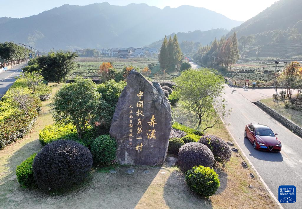 福鼎市赤溪村的“中国扶贫第一村”石碑(2023年12月7日摄,无人机照片)。新华社记者 林善传 摄