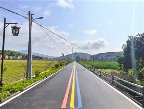 在钟山镇南兴村,已铺好沥青的路面上,一条红、黄、蓝三色交织而成的标线,伴随彩色标线上绘制的“1314”“520”“遇见你遇见爱”等各种浪漫元素,成为乡村道路一道靓丽风景画。