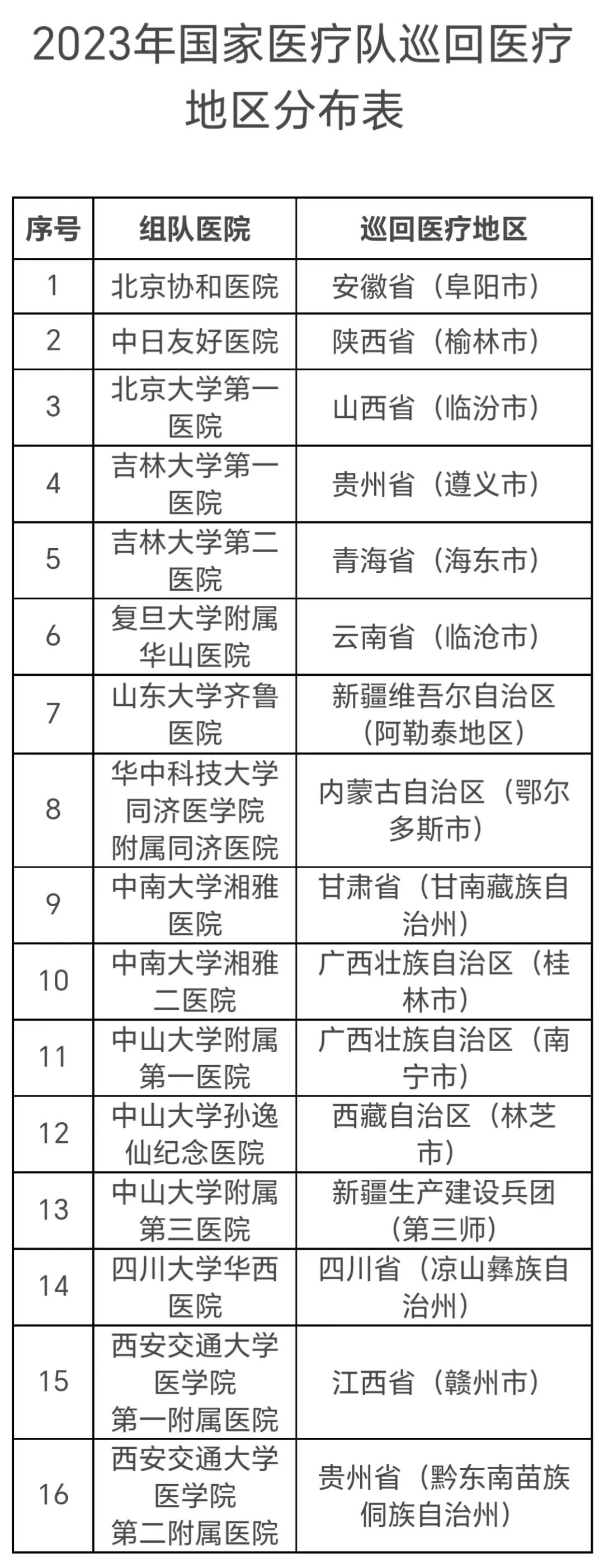 各医院按照2023年国家医疗队巡回医疗地区分布表(附件)派出国家医疗队,重点开展以下工作: