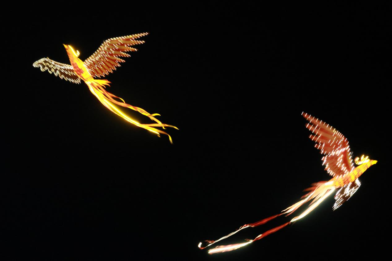 当晚,除了充满民族风格的畲歌畲舞表演,更有凤凰飞天秀。凤凰台上,随着凤凰的鸣叫,两只凤凰振翅划空而来!它们时而并排飞翔,时而变换盘旋,优雅的身姿在夜空中上演“凤凰来仪”的景象。畲族人民自古以“凤凰”为图腾,房屋上处处可见“凤凰朝阳”图案,代代咏颂着关于百鸟之王的动人传说。“凤凰飞天秀”用创新的形式为传统文化赋能,彰显中华文化自信。