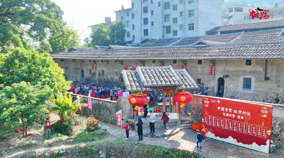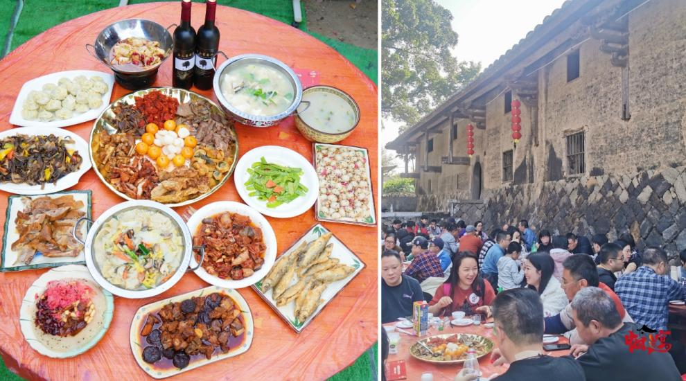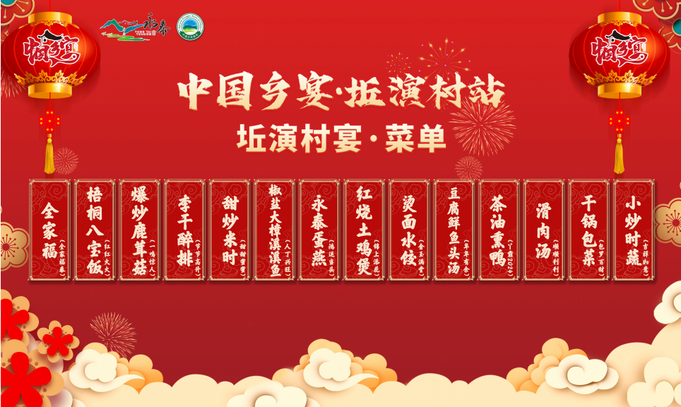佳节配佳肴、新年遇新味,本次活动以“源产地食材”“道地烹饪方式”为原则,特别打造一份由15道菜品组成的《坵演村宴菜单》:全家福(全家福泰)、梧桐八宝饭(红红火火)、爆炒鹿茸菇(一鸣惊人)、李干醉排(节节高升)、甜炒米时(甜甜蜜蜜)、椒盐大樟溪溪鱼(人丁兴旺)、永泰蛋燕(鸿运当头)、红烧土鸡煲(锦上添花)、烫面水饺(金玉满堂)、豆腐鲢鱼头汤(年年有余)、茶油熏鸭(丫霸2024)、滑肉汤(顺顺利利)、干锅包菜(包罗百财)、炒时蔬(吉祥如意),每一道菜品都寓意满满,地道又热闹的“坵演村宴”,笼络了现场无数食客的心。据了解,本次“坵演村宴”不仅吸引了永泰本地及福州周边市民拖家带口参与,也吸引了众多台胞、侨胞前来体验打卡,大家在小坪寨里尝美食、话家常、一起欢乐迎新年。